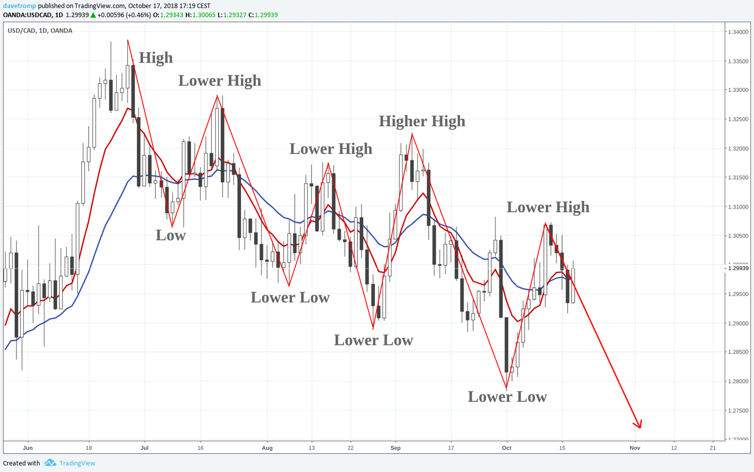 The second way to identify the market trend is to look at the highs and lows of the price swings.